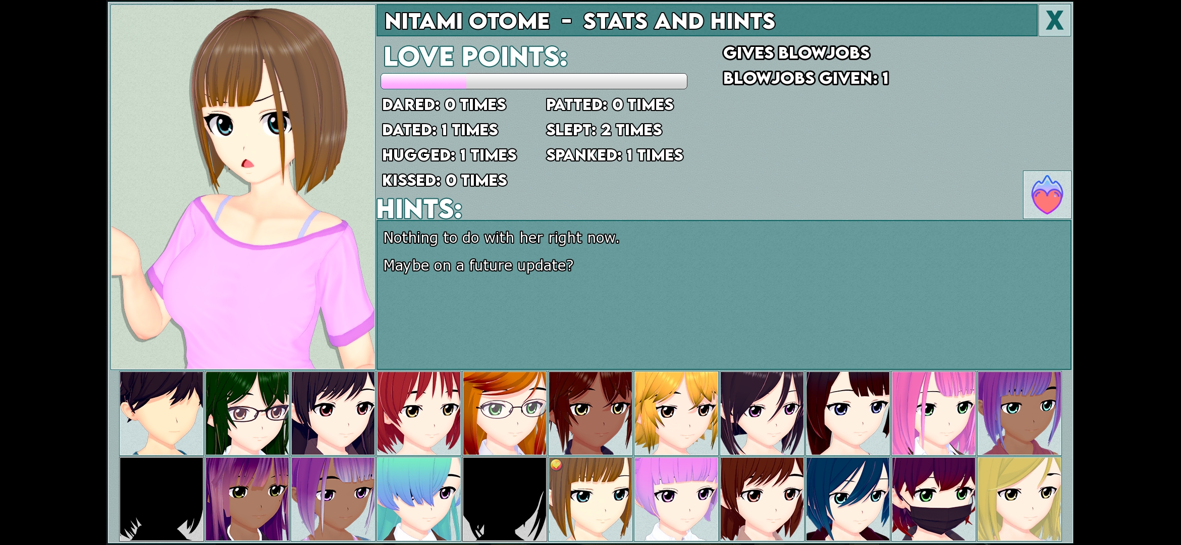 Yeah I Figured it out by modifing the love points like you said. It wasn't super clear how to get more since with the other girls I just got the points by progressing the story so got surprised by that one. Finished the main content now , pretty good so far.