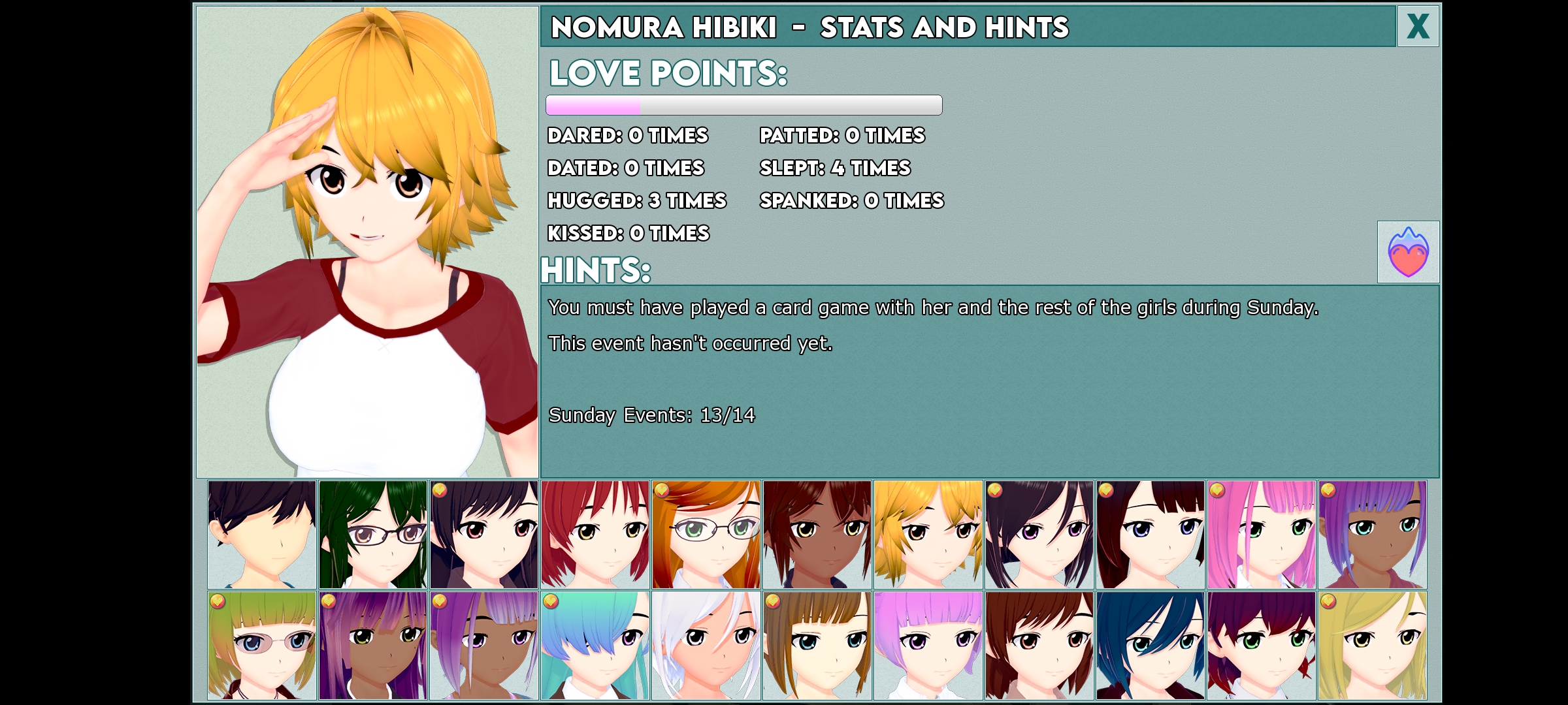 * Pick every girl in the repeatable beach event, at least once * Bang everyone in the repeatable pool event, including Suzume * Bang the three unique Aurora clients, Manami, Sayo and Shiori